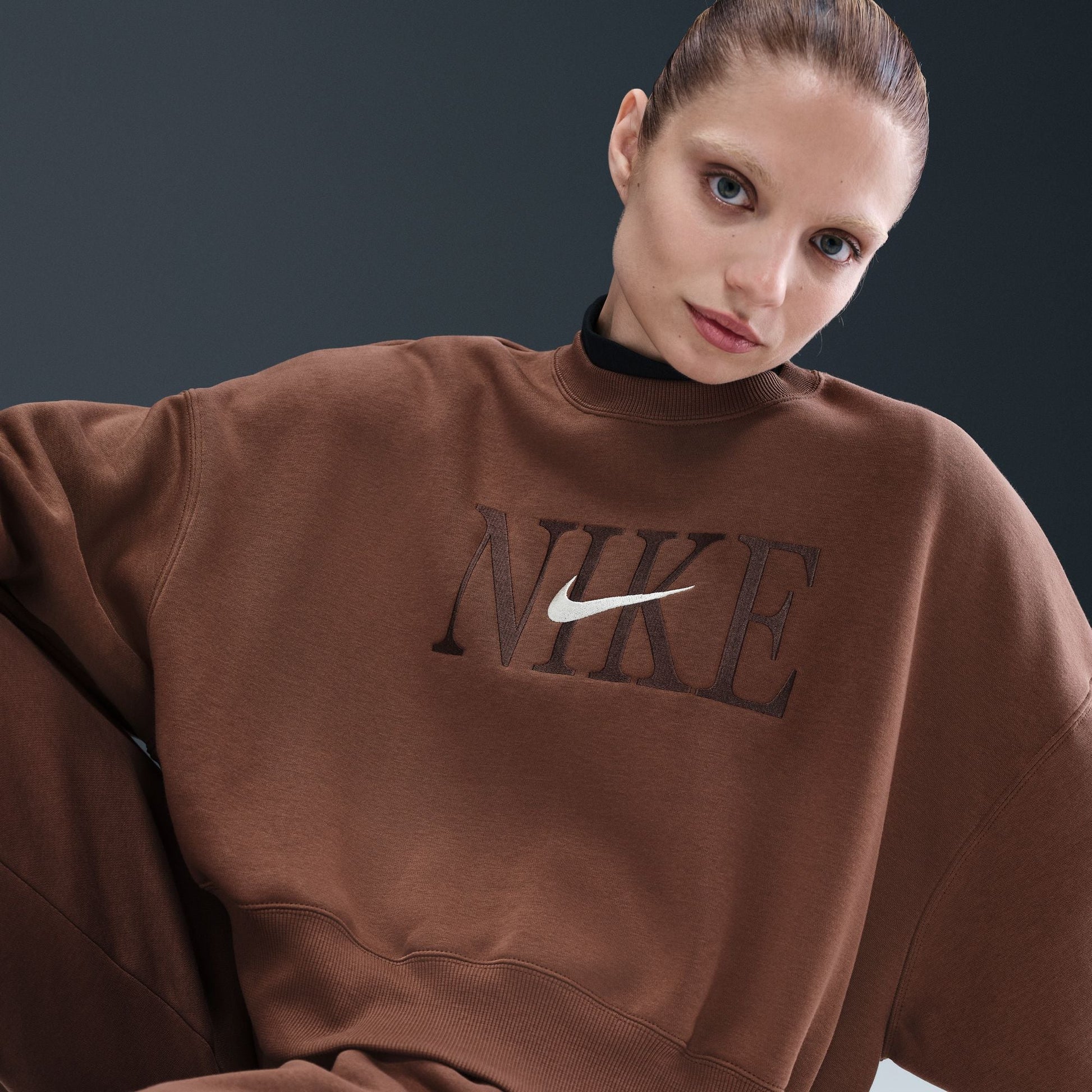 The Nike Women’s Phoenix Fleece Cropped Crewneck in Armory Navy combines cozy comfort with a confident edge. Crafted from premium brushed fleece, it features dropped shoulders and a relaxed cropped fit for a flattering silhouette. The raised “NIKE” embroidery with a bold Swoosh logo across the chest adds a modern twist to this everyday essential — perfect for layering or styling solo.